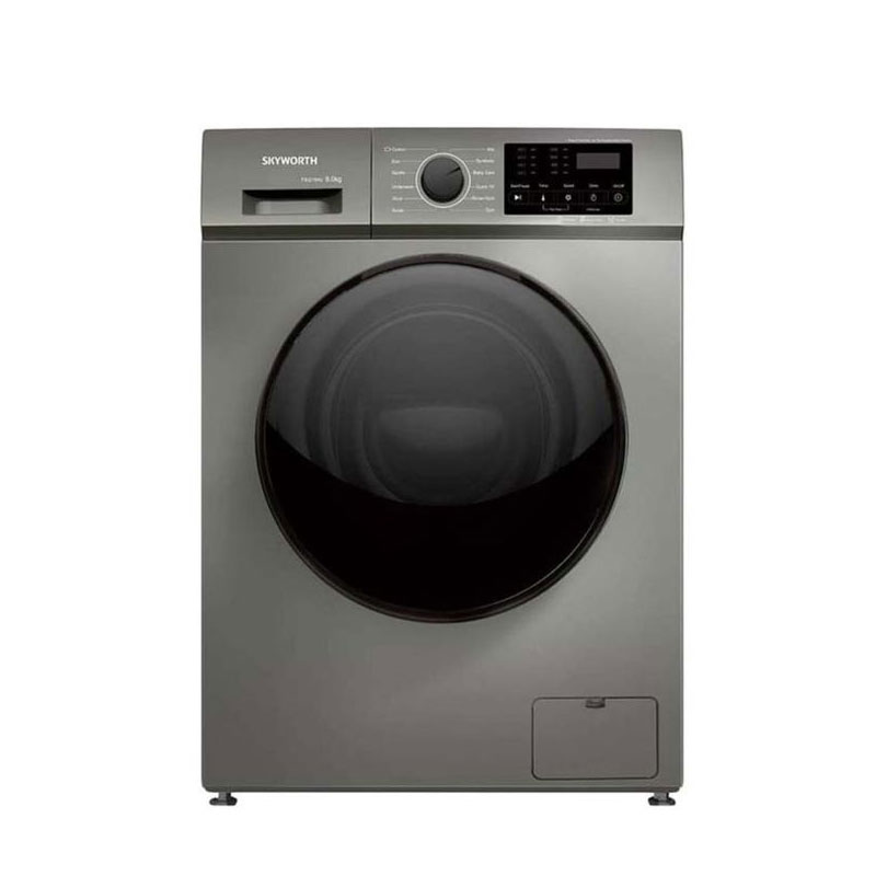 8KG Skyworth front-load washer with a clean silver body and practical wash-program setup.